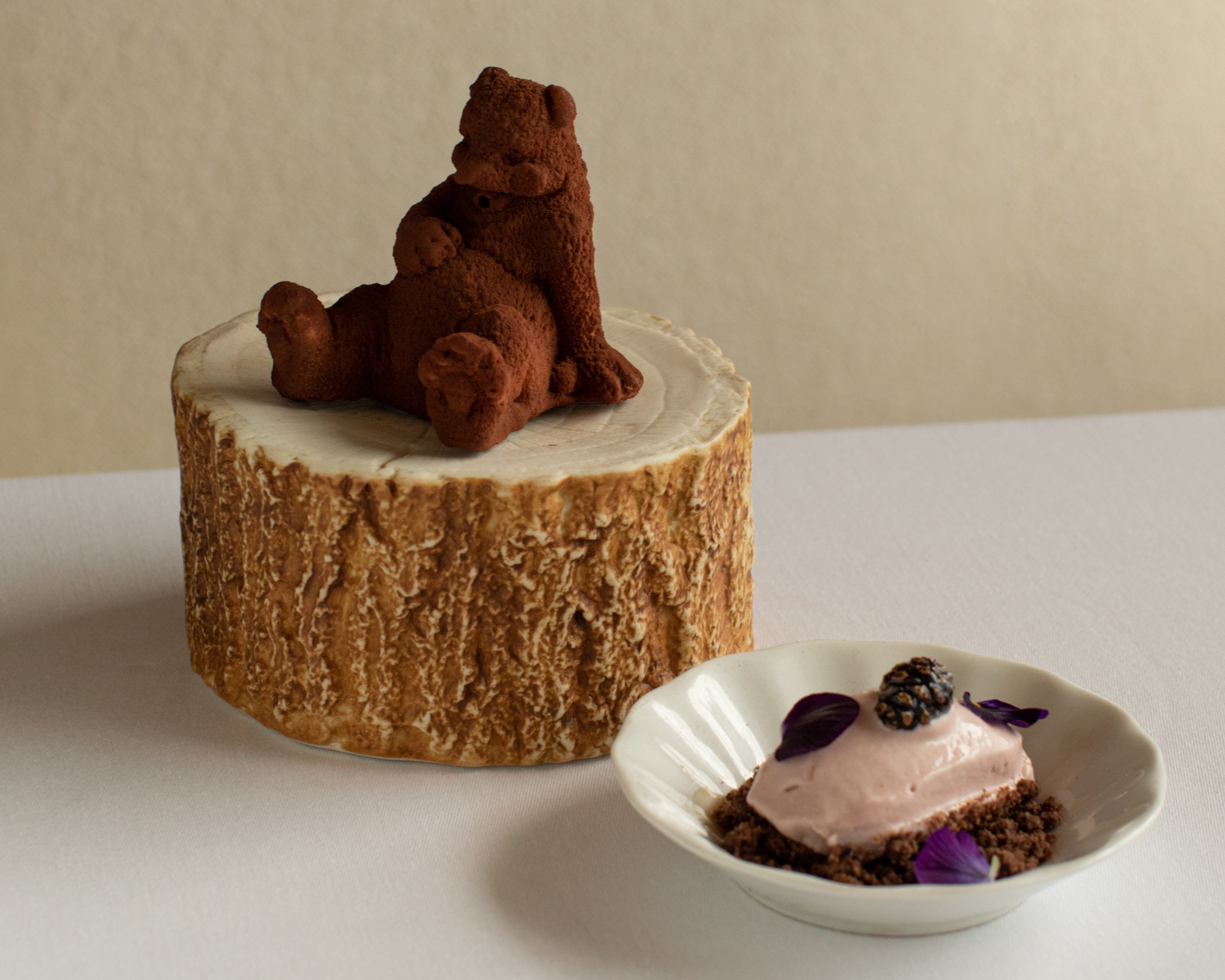 配料:鸟樱桃蜂蜜蛋糕、酸奶油甘纳许、覆盆子和牛奶冰淇淋